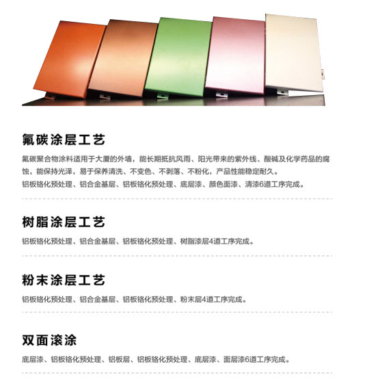氟碳涂層具有抗腐蝕性和耐候性,耐冷性好,能抵御強烈的紫外線的照射,并長期保持不褪色、不粉化、涂屏均勻,色彩豐富多樣,使用壽命長。